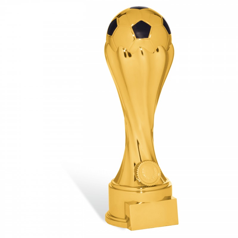 Trofeo in PLASTICA soggetto CALCIO. Personalizzazione del cono con etichetta tonda. Targhetta SEMPRE compresa.