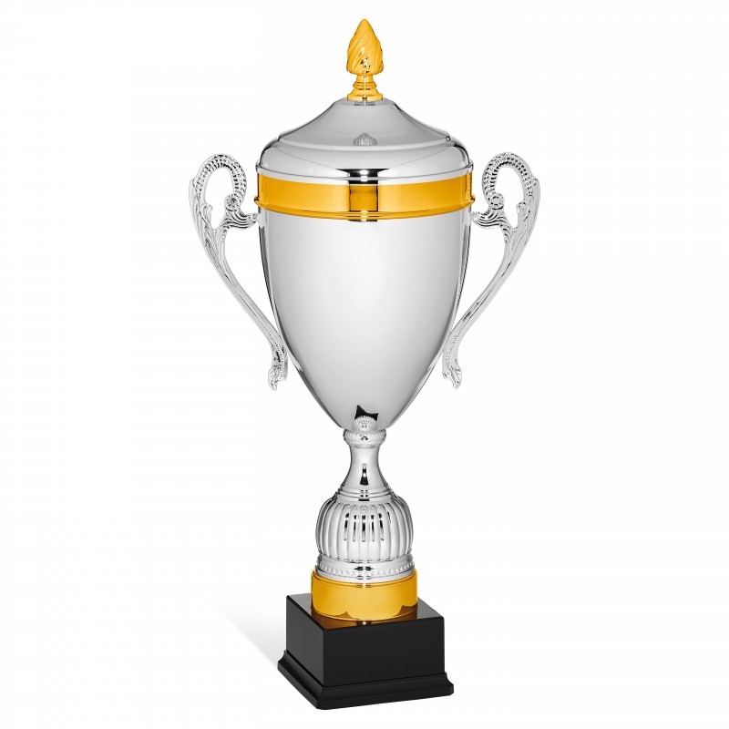 Coppa con tazza in metallo e manici e coperchio. Targhetta sempre compresa.
