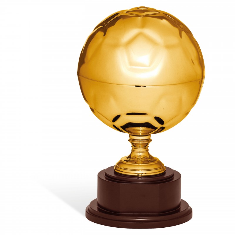 Trofeo calcio, dettaglio pallone da calcio e base legno. Targhetta SEMPRE compresa.