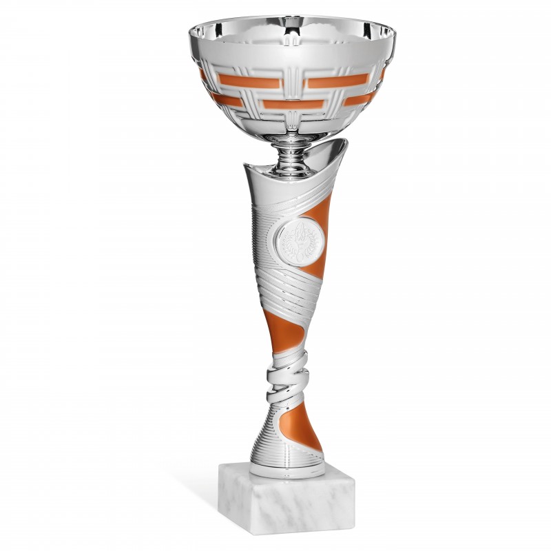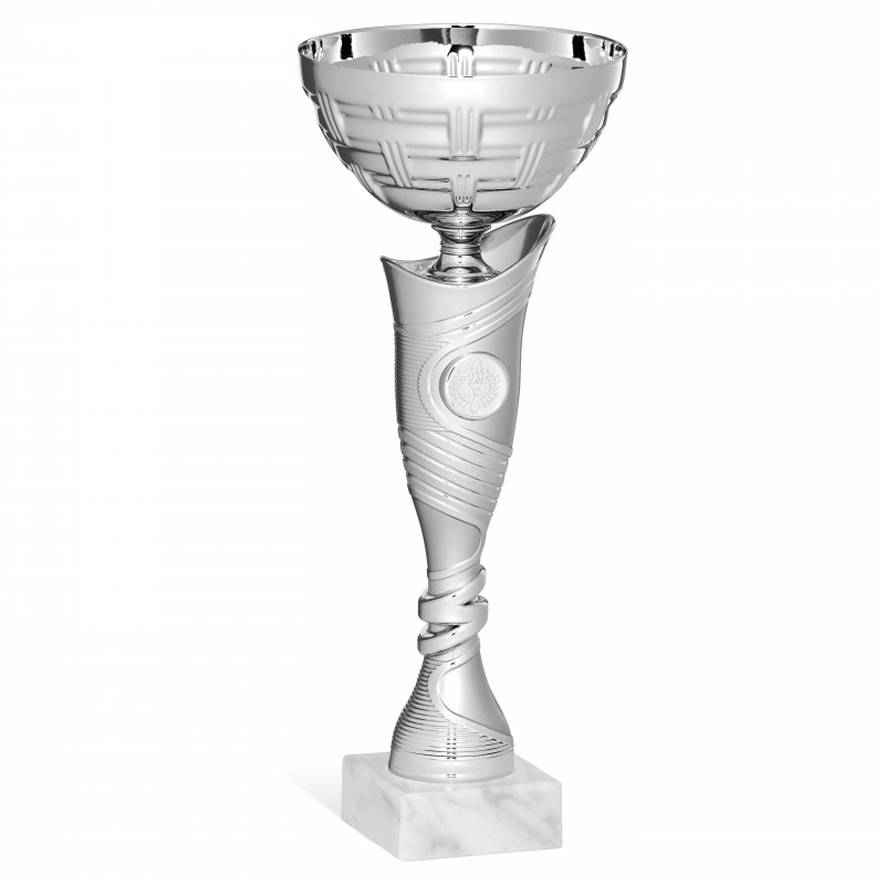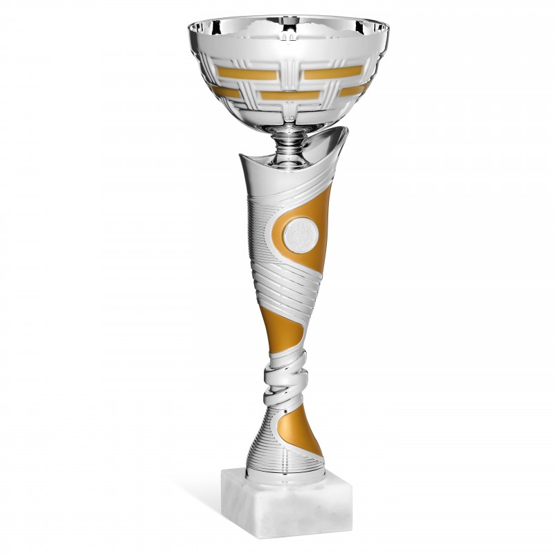 Coppa con tazza in metallo disponibile nelle tre colorazioni con personalizzazione del cono con etichetta tonda. Targhetta ed etichetta compresa.