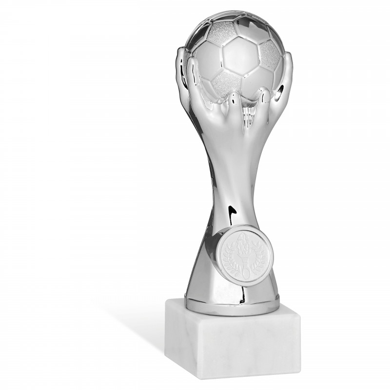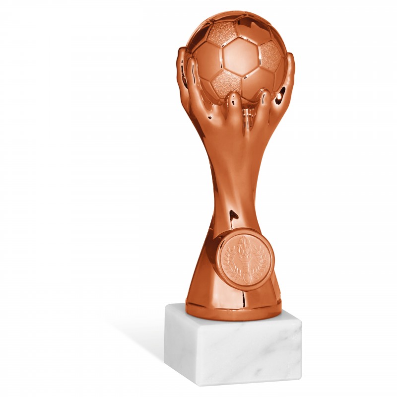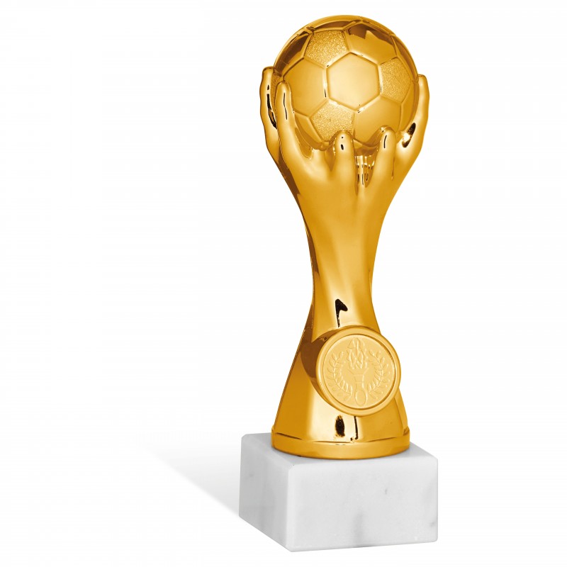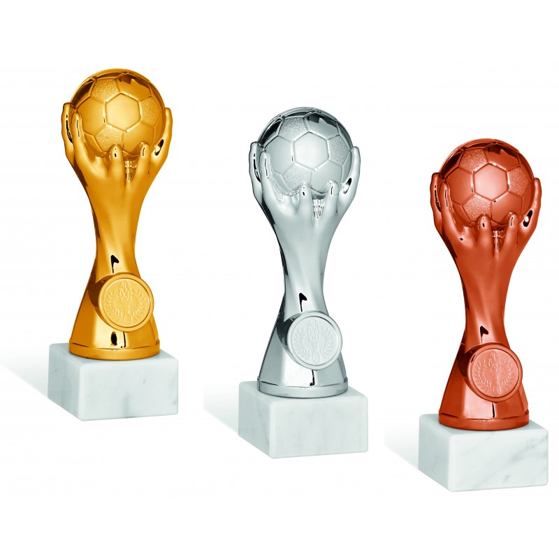 Coppa in plastica oro, argento e bronzo soggetto calcio. Personalizzazione del cono con etichetta tonda mm 25. Targhetta sempre compresa.