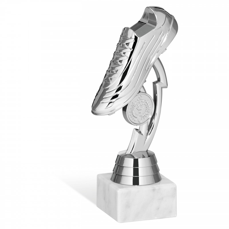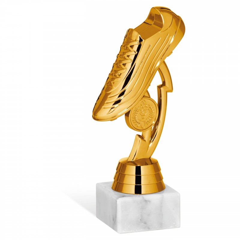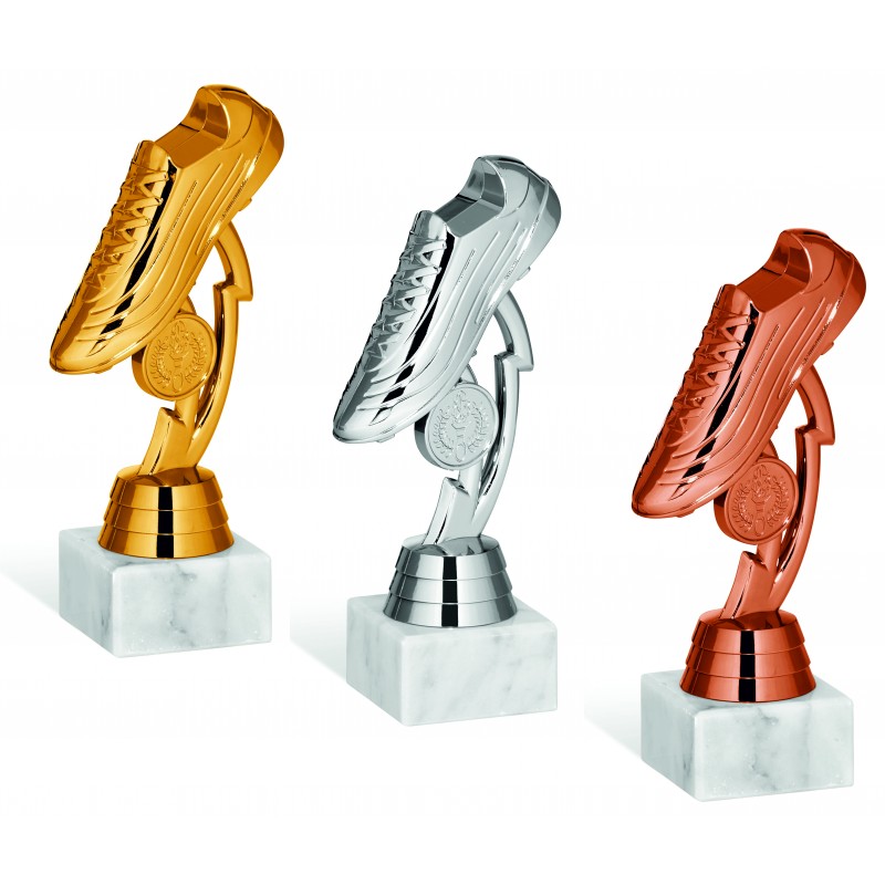 Coppa in plastica oro, argento e bronzo soggetto calcio. Targhetta sempre compresa.