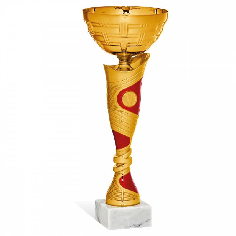 Coppa con tazza in metallo e personalizzazione del cono con etichetta tonda. Targhetta SEMPRE compresa.